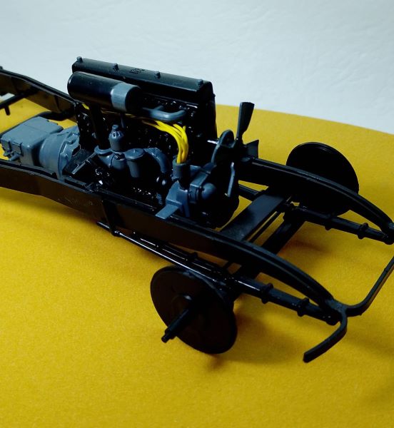 - Motor de seis cilindros con válvulas en cabeza (7,67 litros) y transmisión de cuatro velocidades, cableado del motor.
