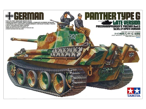Longitud: 257 mm. La imagen muestra el kit pintado y ensamblado. Un diseño refinado Después de su aparición a mediados de 1943, el Panther fue uno de los pilares del blindaje alemán hasta el final de la Segunda Guerra Mundial. La variante Ausf.G (tipo G) estuvo disponible para las tropas desde 1944, y fue mejorada en la segunda mitad del año: las correcciones incluyeron una alteración en la sección inferior del escudo del arma para evitar que los impactos directos ingresaran al espacio de la tripulación, y se le dio un diseño más saliente para mejorar aún más la capacidad de supervivencia; los escapes amortiguados mejoraron el sigilo durante la noche; y se agregaron tomas de aire en las rejillas del motor para suministrar a la tripulación aire caliente en condiciones de frío. Movilidad, poder ofensivo y capacidad de supervivencia: el Panther logró un notable equilibrio de los tres que lo convirtió en un gigante entre los blindados de la Segunda Guerra Mundial.