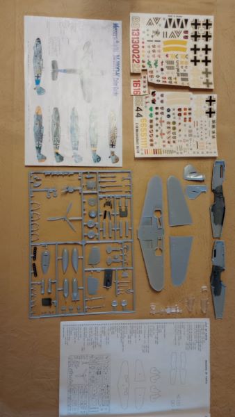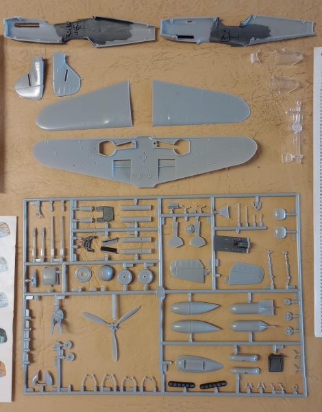 - Piezas sueltas, separadas del sprue y cockpit empezado a armar y algunas partes pintadas.
