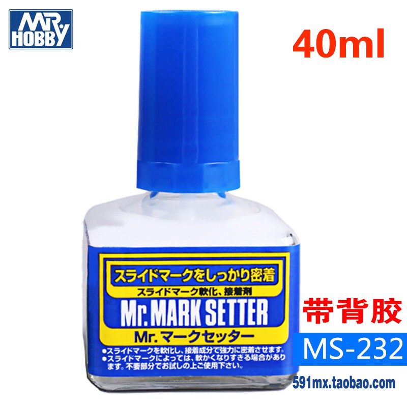 Mr. Mark Setter es un componente adhesivo, que le da a las calcas una mayor adherencia a las piezas de plástico. Es mucho más fácil pegar calcomanías en una pieza de modelo de plástico donde las piezas tienen una superficie rugosa o irregular. Primero, se pinta el área en la que se colocará la calcomanía y luego se aplica la calcomanía. Después de eliminar las burbujas de aire presionando la calcomanía con un hisopo de algodón, se aplica una capa de Mr.Mark Setter y se deja secar. Debido a que la calcomanía ahora tiene un mayor grado de adhesión, el plateado adhesivo (la calidad flotante y brillante de las partes transparentes de las calcomanías) se reducirá o eliminará en gran medida, y las calcomanías se pueden pegar firmemente en superficies irregulares. Es perfecto incluso para calcas mal hechas. Las calcas tendrán mayor adherencia si la superficie pintada se prepara con un acabado brillante.