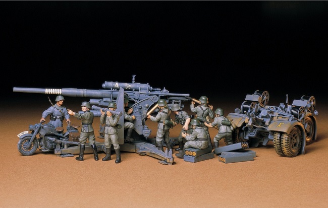 Este kit de ensamblaje de plástico a escala 1/35 representa el temido cañón alemán Flak36/37 de 88 mm de la Segunda Guerra Mundial. ★ Se utilizan más de trescientas piezas para construir este kit realista. ★ Las piezas móviles permiten la elevación y rotación del cañón, mientras que el remolque se fija con tornillos. ★ Incluye una maqueta de motocicleta y nada menos que nueve figuras en pose de acción.