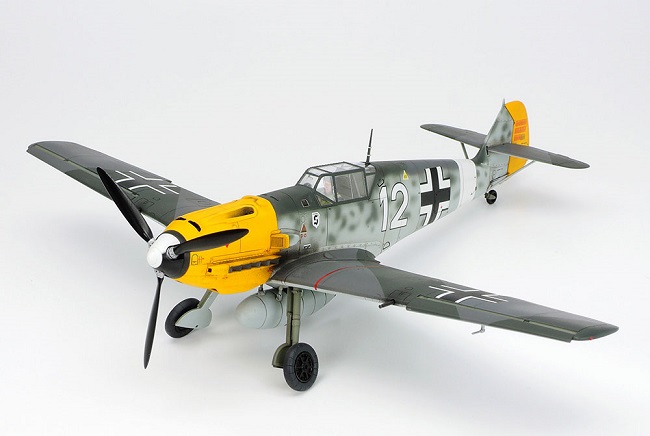 El Messerschmitt Bf 109 E fue el caza principal de la Luftwaffe en las primeras etapas de la Segunda Guerra Mundial. Esta maqueta muestra el E-4, fabricado a partir de mayo de 1940 y que participó activamente en la Batalla de Inglaterra, o el E-7, equipado con un tanque de combustible desmontable para mayor alcance. Una versión Trop con filtro para arena se vio en los cielos del norte de África.