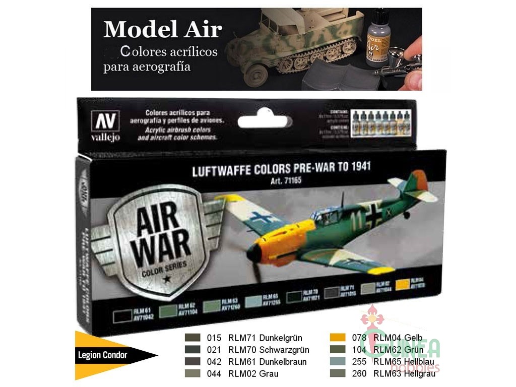 Estuche de colores Model Air desarrollado para pintar esquemas de camuflaje de cualquier tipo de avión de la Luftwaffe, previos a la Segunda Guerra Mundial y Guerra Civil Española “Legión Cóndor”, así como las campañas o fases iniciales del conflicto: Polonia, Países Nórdicos, Batalla de Francia, Batalla de Inglaterra, etc.