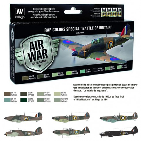 Estuche de colores Model Air desarrollado para pintar los caza de la RAF que participaron en el mayor choque aéreo de todos los tiempos: “La batalla de Inglaterra”, desde su comienzo en Julio de 1940, y su fase final o “Blitz Nocturno” en Mayo de 1941.