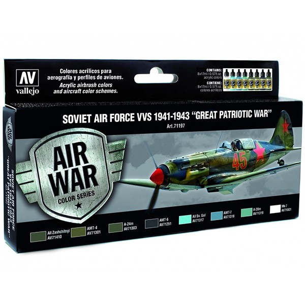 Estuche de colores Model Air desarrollado para pintar los esquemas de camuflaje de aviones soviéticos y sus distintas combinaciones de colores, del comienzo de la “Gran Guerra Patriótica” en Junio de 1941 hasta el año 1943, punto de inflexión en el Frente del Este.